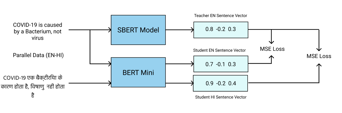 In this project we demonstrate a way of training an extremely small BERT model (mini BERT) using labels from a larger model (Sentence BERT) using Knowledge Distillation method. Doing this allows us to train the model to have a shared embedding space between languages and also learn the rich semantics of a larger SBERT model, which are very effective in sentence level classification tasks.